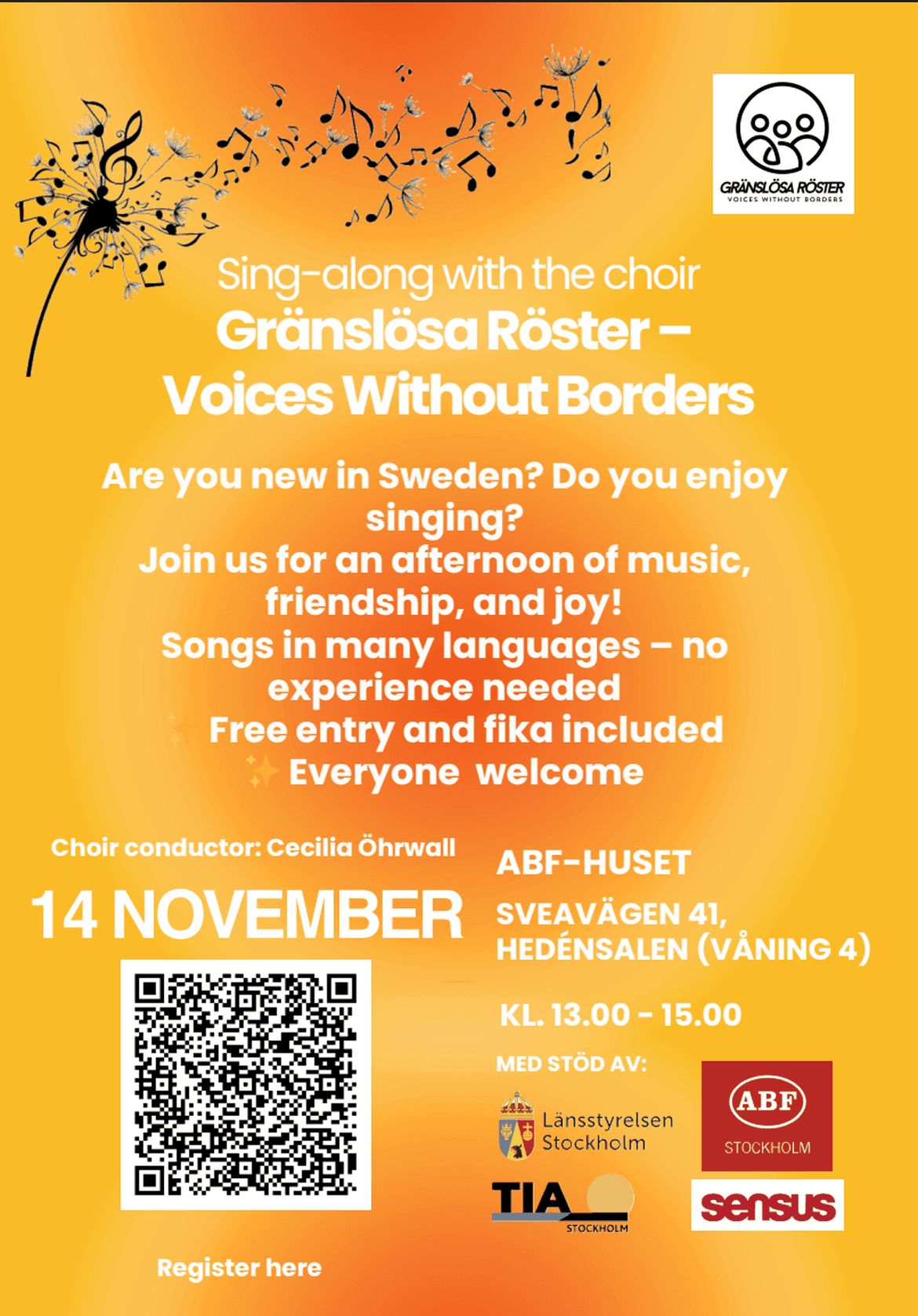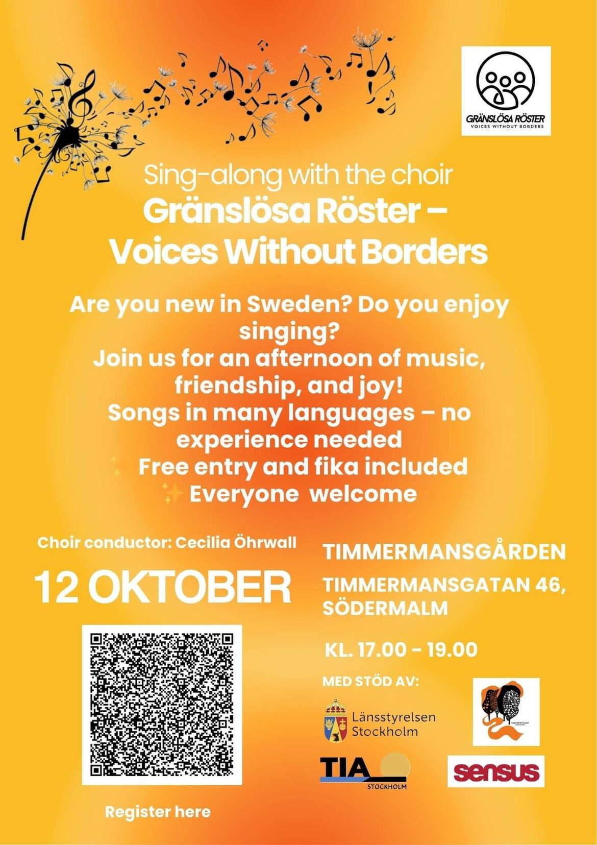 We are organising this event in collaboration with TIA-Stockholm (Early Support for Asylum Seekers), with support from the County Administrative Board of Stockholm (Länsstyrelsen). The aim is to give asylum seekers and Ukrainians without a Swedish personal identity number the opportunity to get closer to Swedish society and discover the joy of singing together in our choir.